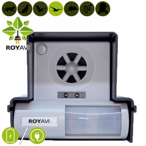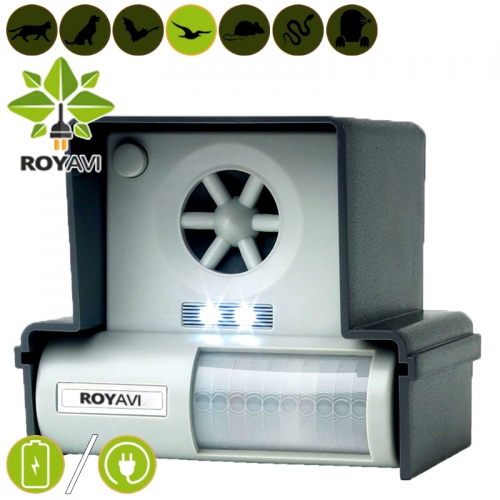 רויאבי הדברה אלקטרונית גאה להציג את מרחיק החתולים המשולב החדש, מכשיר זה משתמש גם בקולות סוניים וגם בקולות אולטרסוניים. מרחיק החתולים מצוייד בפאנל סולארי ולכן אין צורך בנקודת חשמל באיזור. ההרחקה האלקטרונית היא הדרך ההומאנית ביותר והירוקה ביותר להרחקת חתולים.